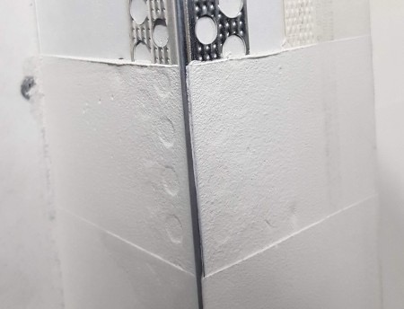 • Plasterboard seams are filled with filler IGIS T, inserting it as deep as possible, using a plastering trowel of convenient width. When using a plastering trowel of the width of the reinforcing mesh – scrim tape, paper tape or glass cloth is immersed in the IGIS T filler mass, the excess of which must be removed to obtain a strip of filler of the width of the reinforcing mesh or slightly wider without defects. Using a 90-100 mm wide plastering trowel, another layer of IGIS T putty is applied to the seam, trying not to leave rough terrain irregularities. The places of fastening screws are also filled with IGIS T filler. Filler IGIS T, after slightly diluting it with clean water, is also convenient to use for installing aluminium corners (thin coat angle beads). The filler dries in 8-24 hours at a temperature of 20°C and relative humidity of 65%.